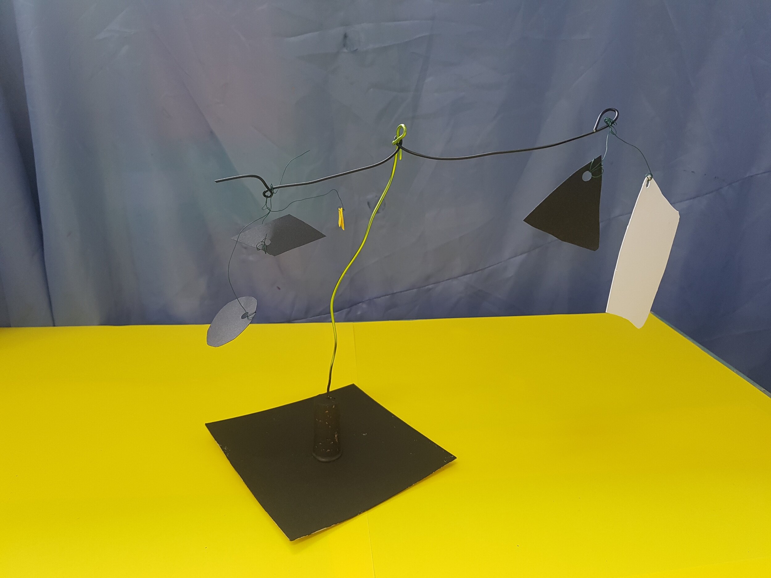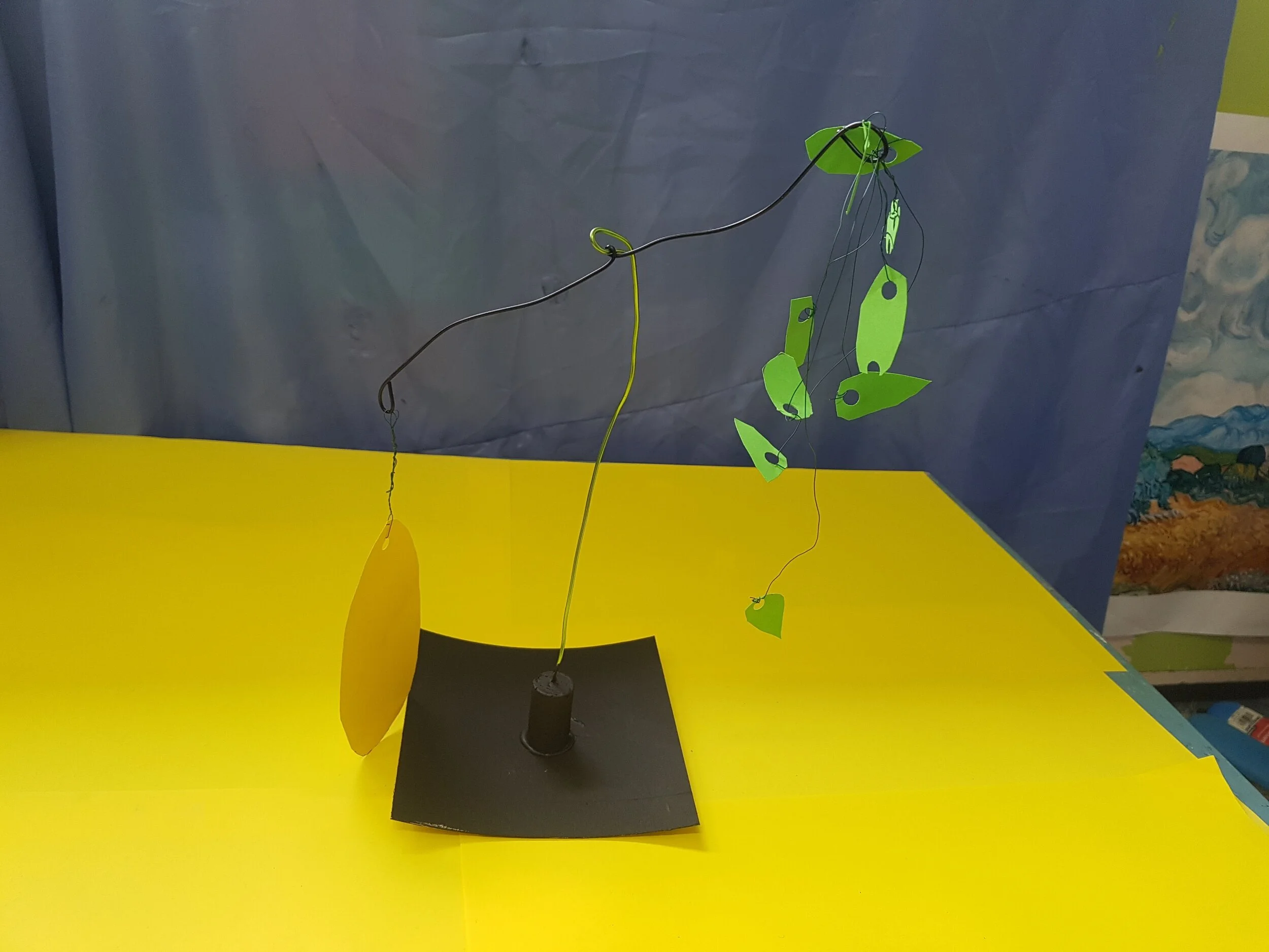 Today I had Alex’s class and a few students from Amy’s class. They explored balance, colour and shape by studying the art of Alexander Calder. Alexander Calder was a kinetic artist who created multi-layered, geometric mobiles. His designs were often based on nature, such as Snow Flurry, 1950 and Two Moons, 1969. We had a look at images and videos of some of Calder’s works. The students had a discussion about the materials, colours and design of Calder’s artworks.