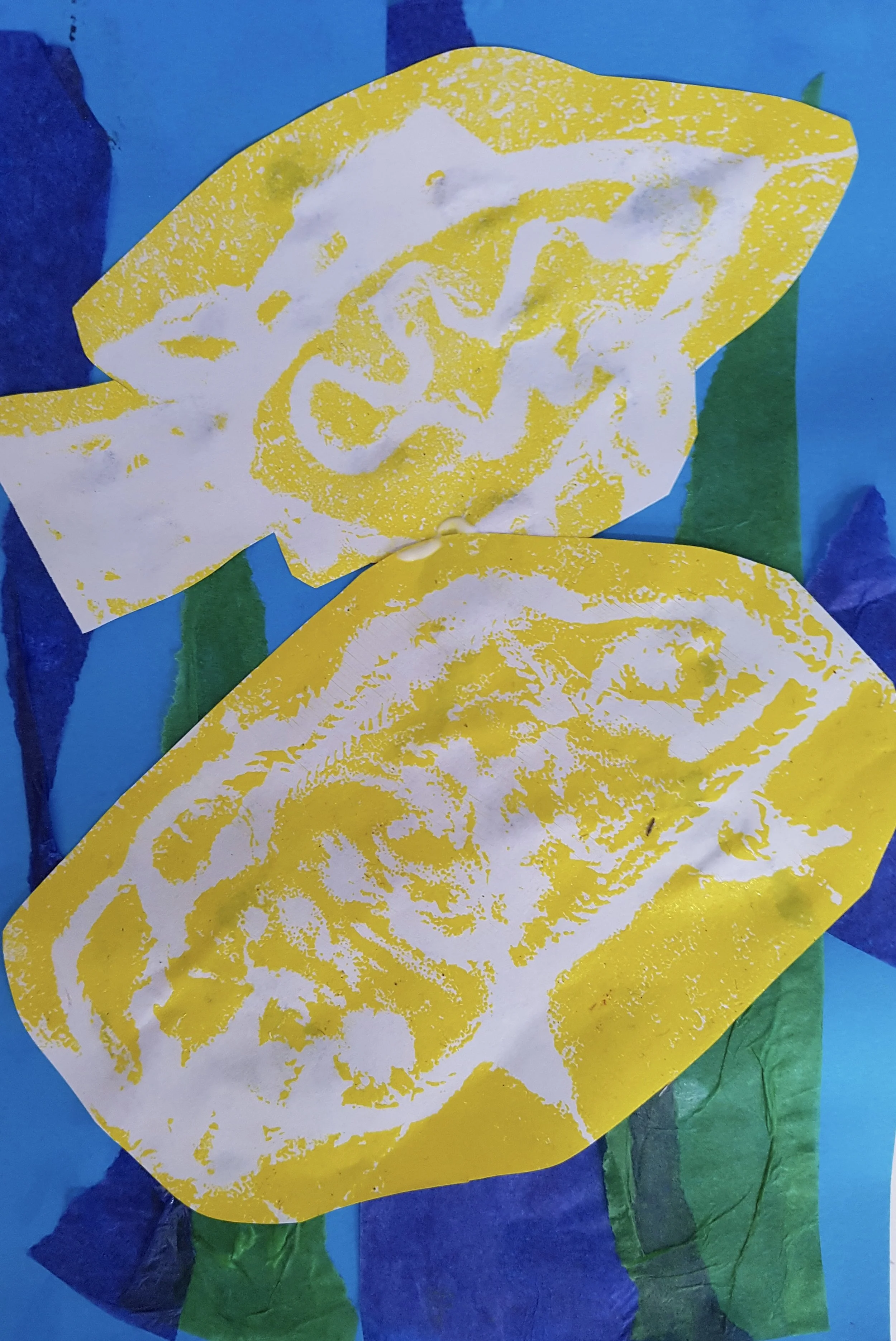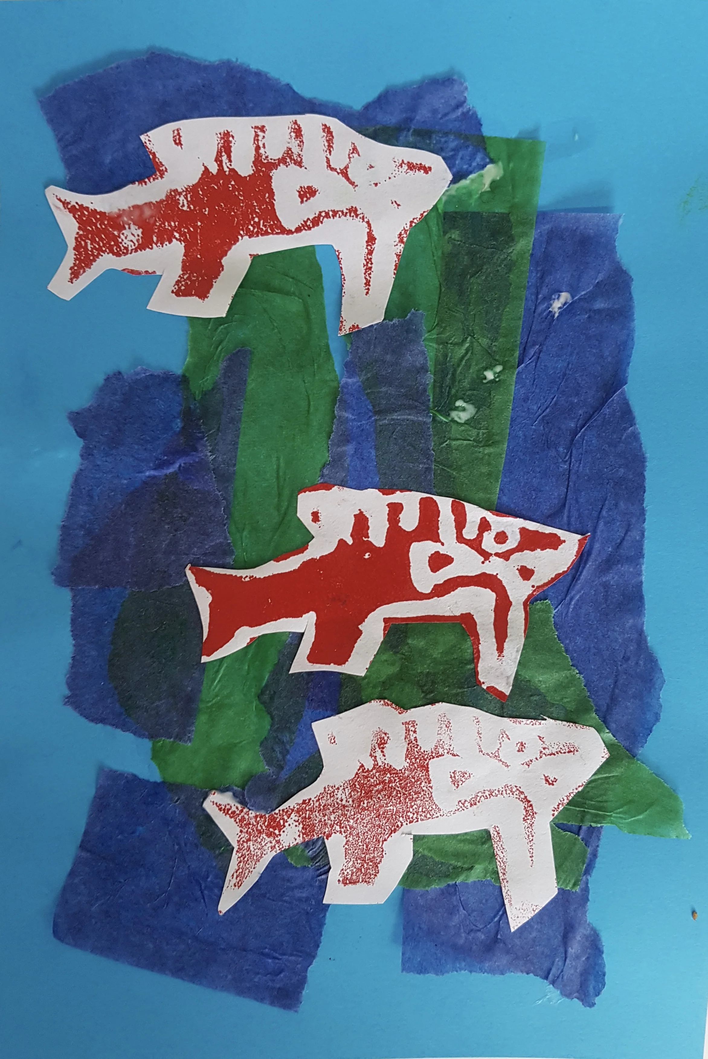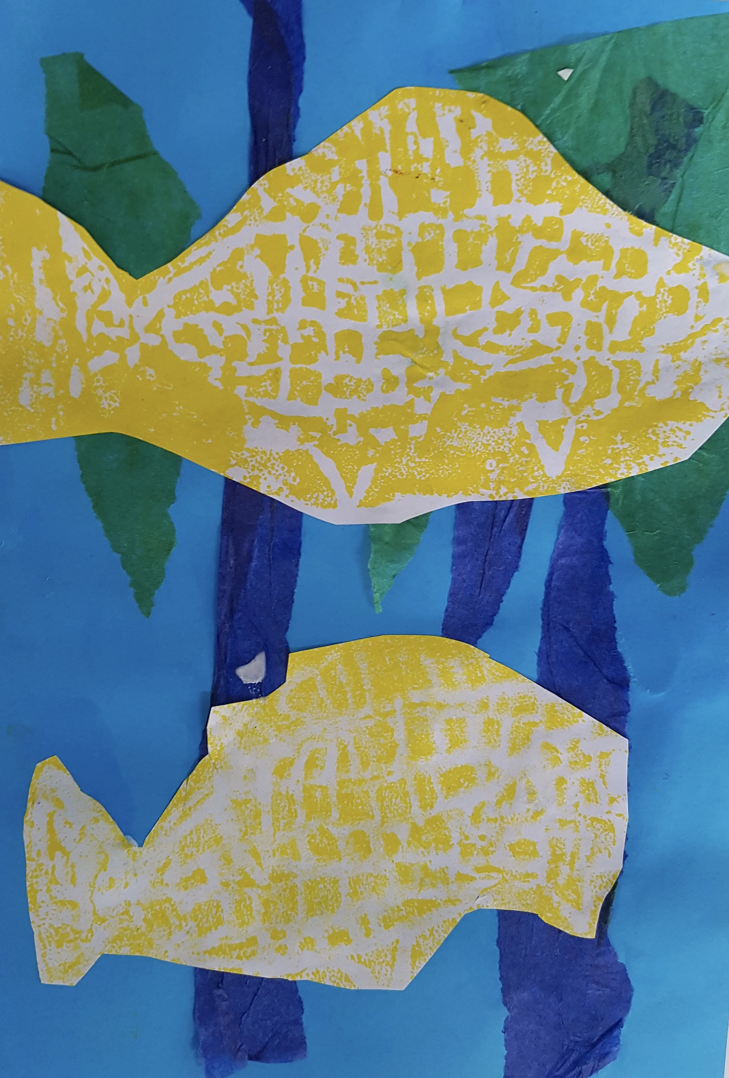 The students kept kept some of the prints to take home and cut out others to arrange over a collaged seaweed background. I had lots of fun teaching today’s lesson. It was a pleasure to introduce printmaking to the Year One and Twos.