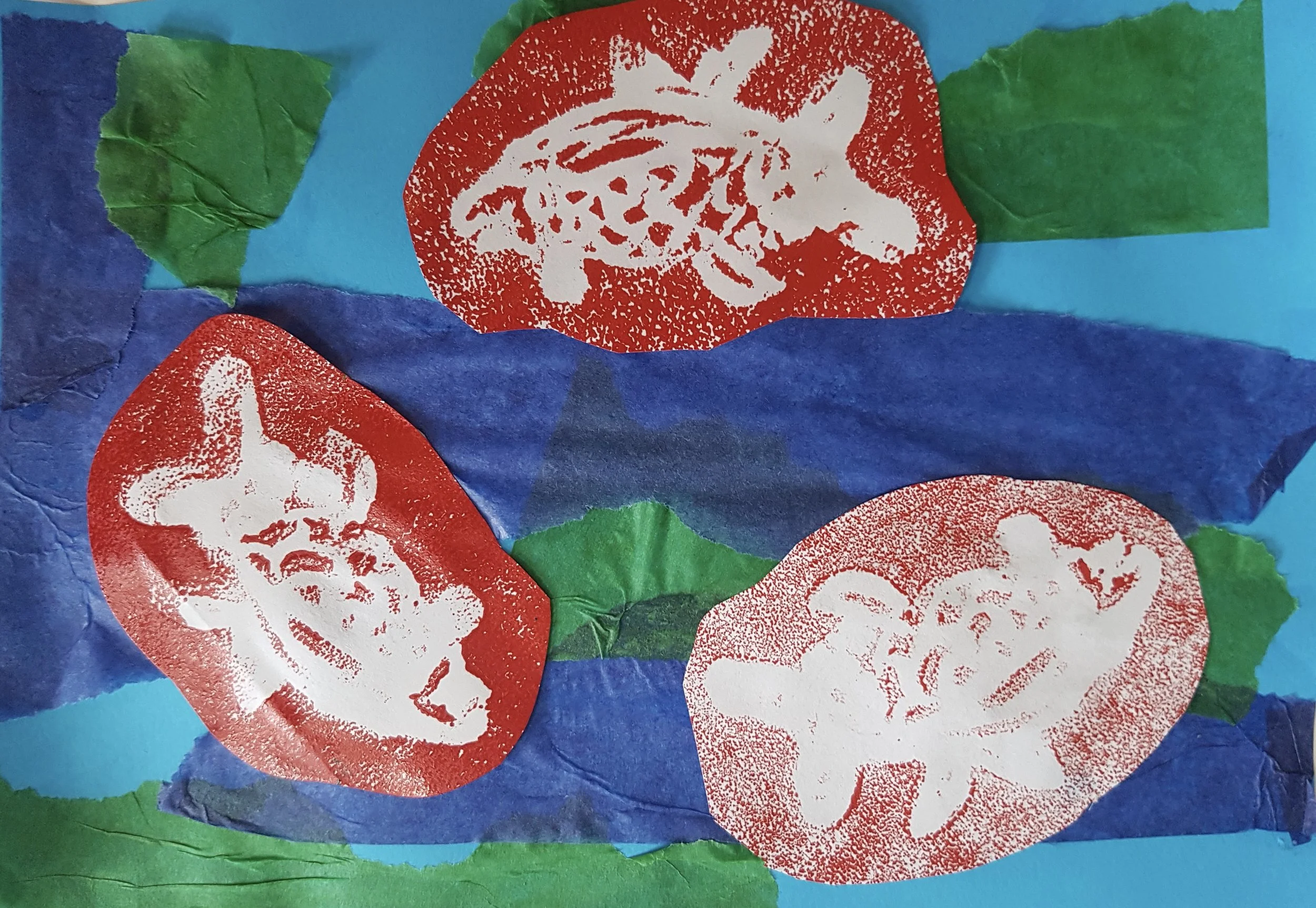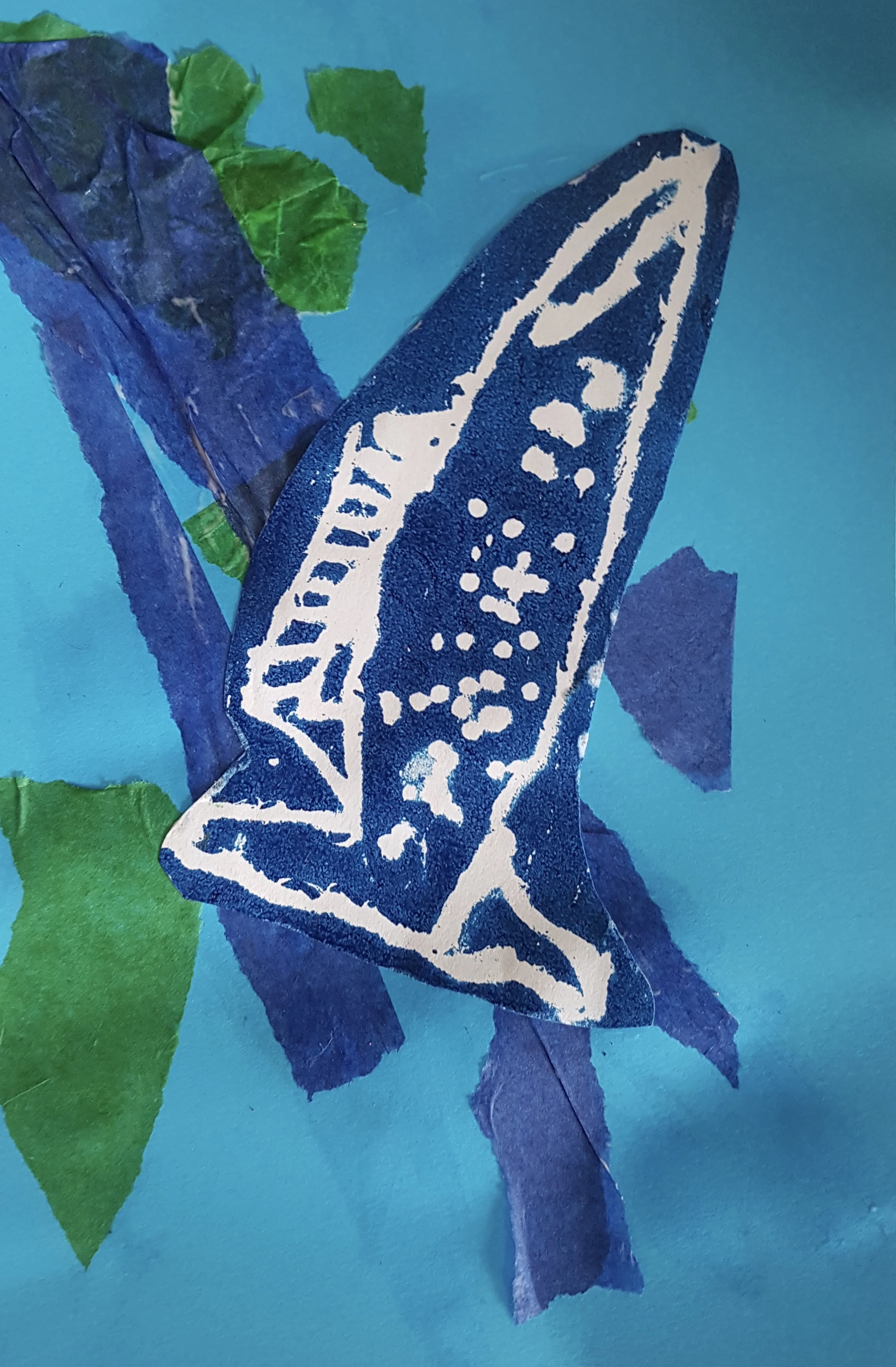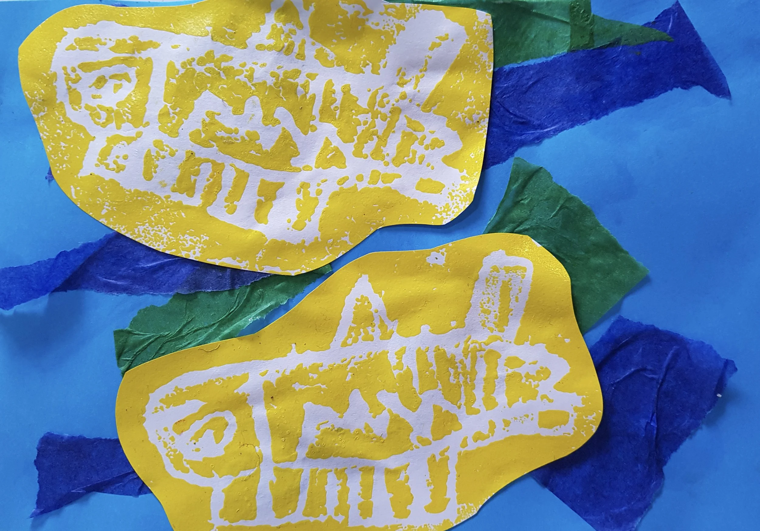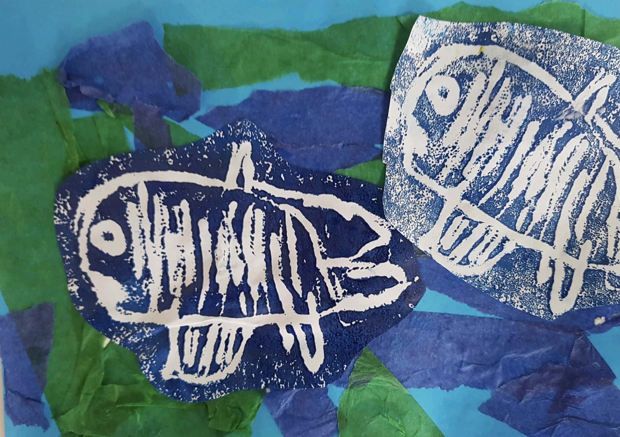The students kept kept some of the prints to take home and cut out others to arrange over a collaged seaweed background. I had lots of fun teaching today’s lesson. It was a pleasure to introduce printmaking to the Year One and Twos.