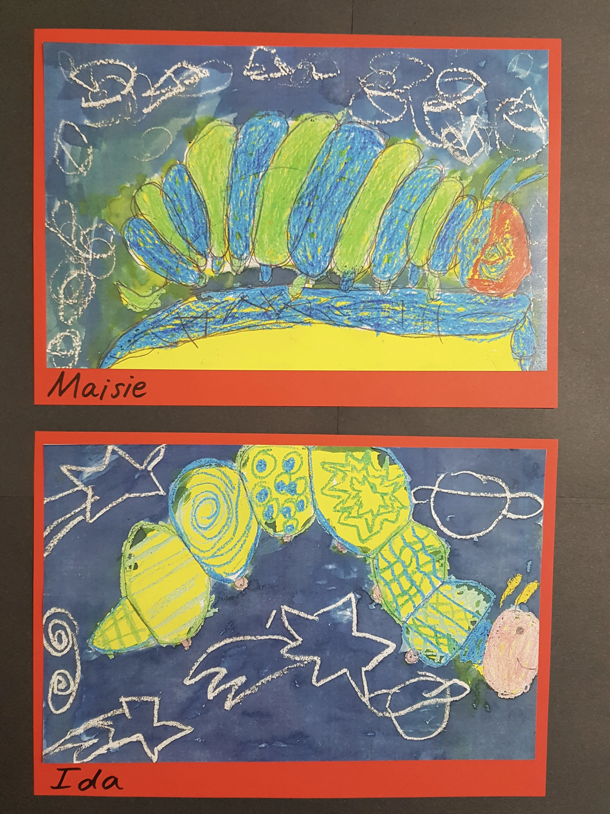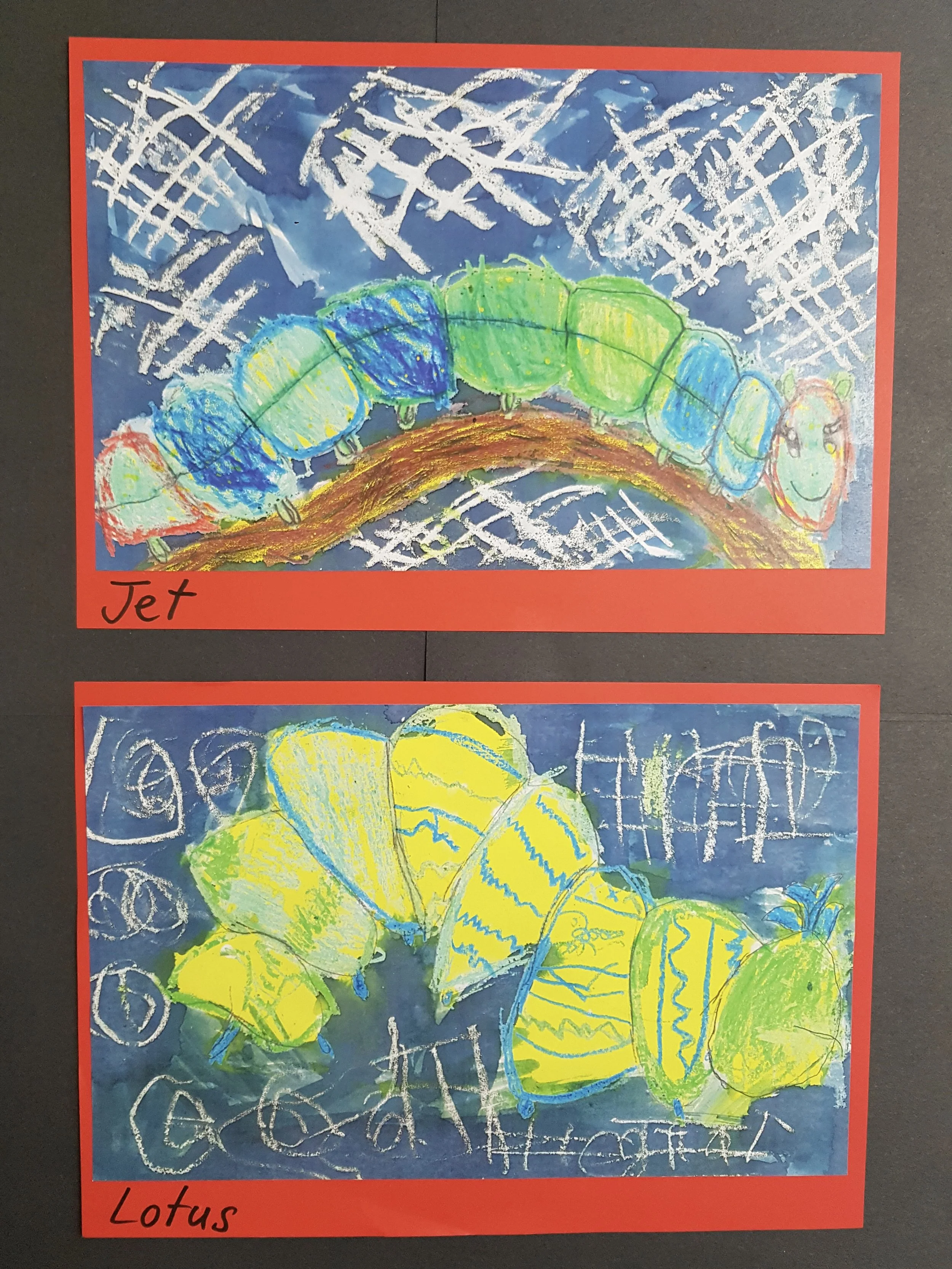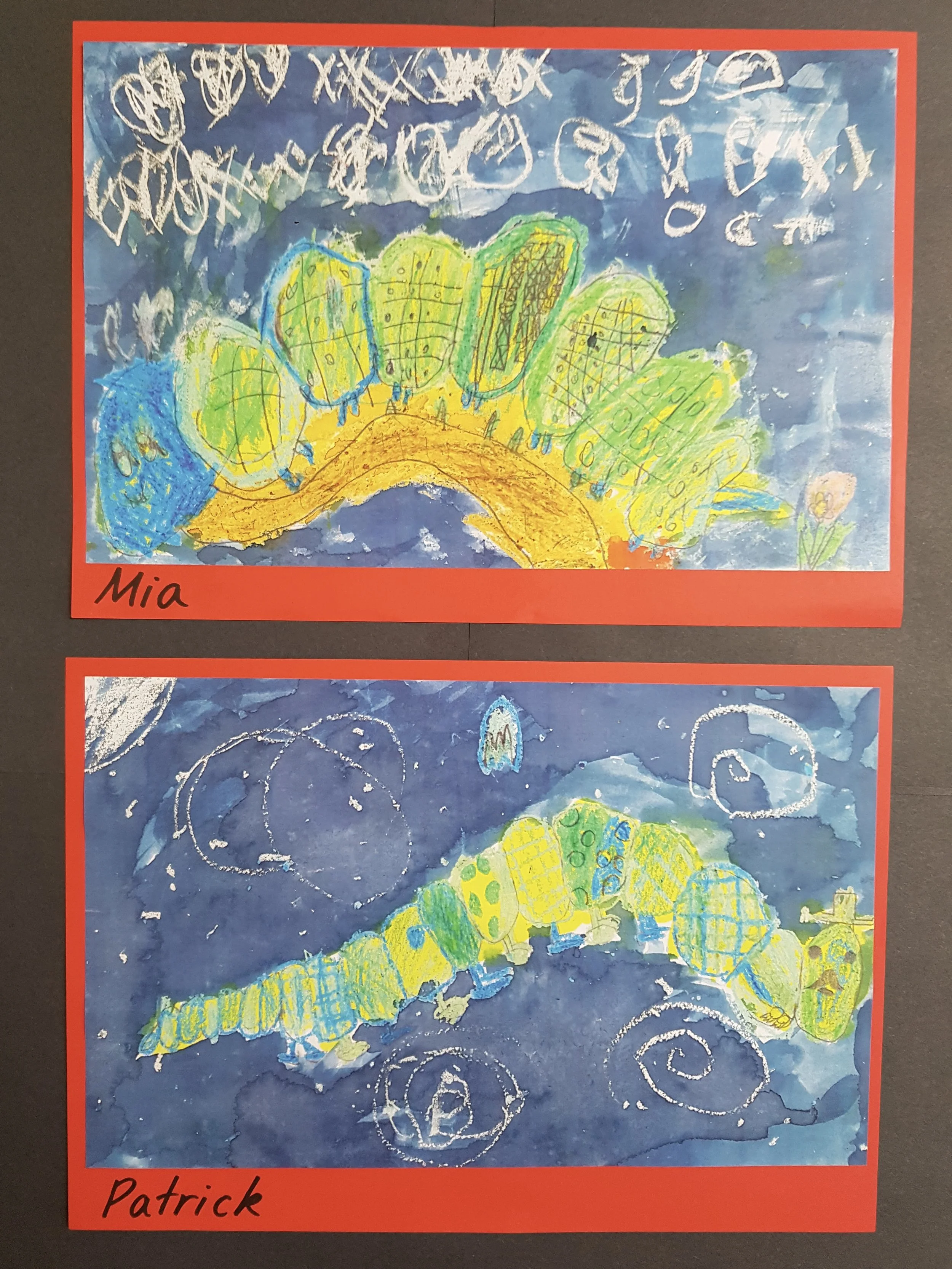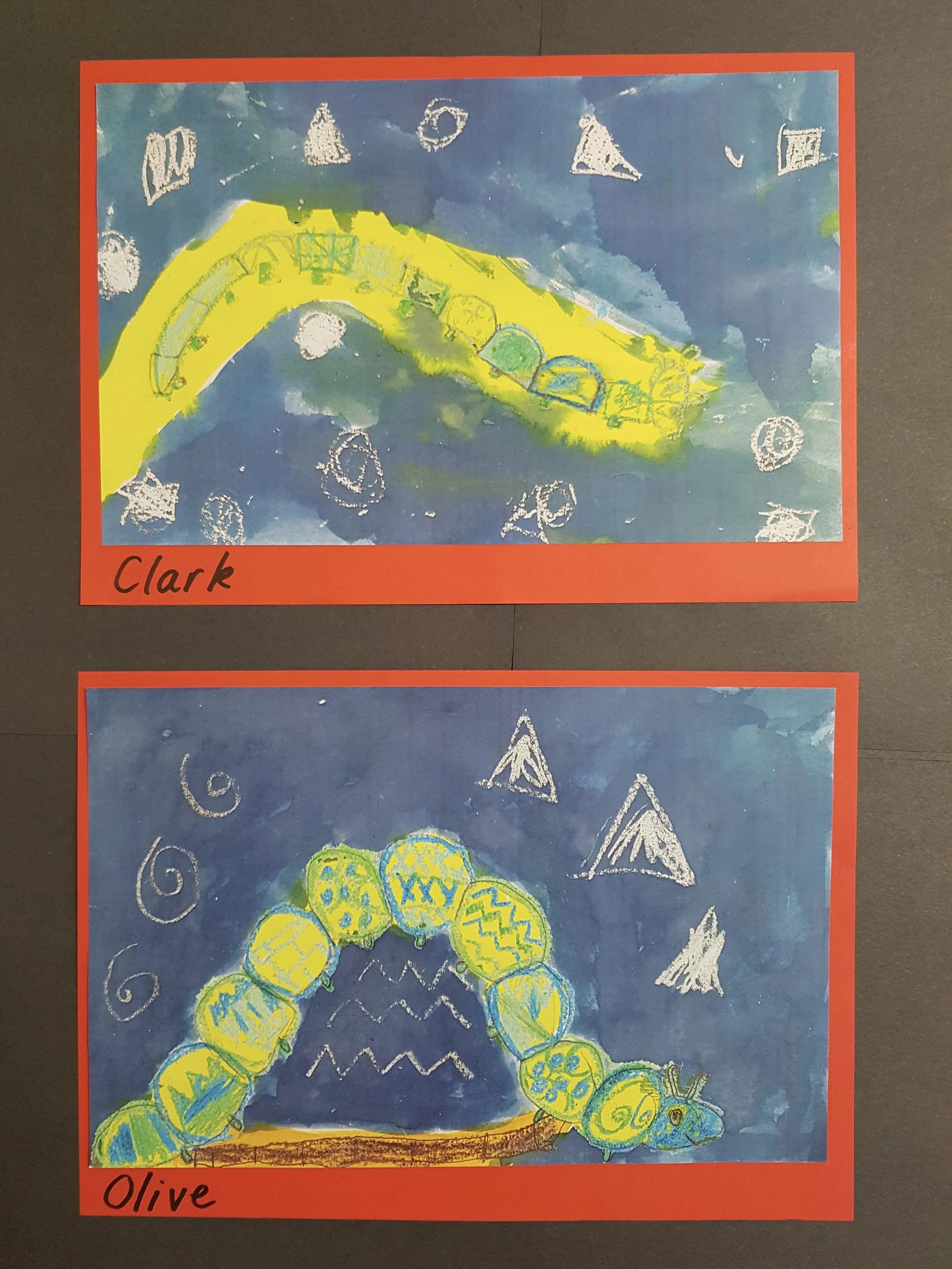 The students learnt to work with patterns by learning to draw a squishy caterpillar (thanks to Art Projects for Kids). They practiced making different sorts of patterns with crayon and came up with lots of ideas for patterns such as spirals, cross hatching, dots, bubbles, bricks, squiggly lines, zig-zags and stars. The students drew their caterpillars with crayons and then we used dye to complete the caterpillars. There were many 'oohs' and 'ahhs' as the students used the dye to reveal the crayon patterns beneath.