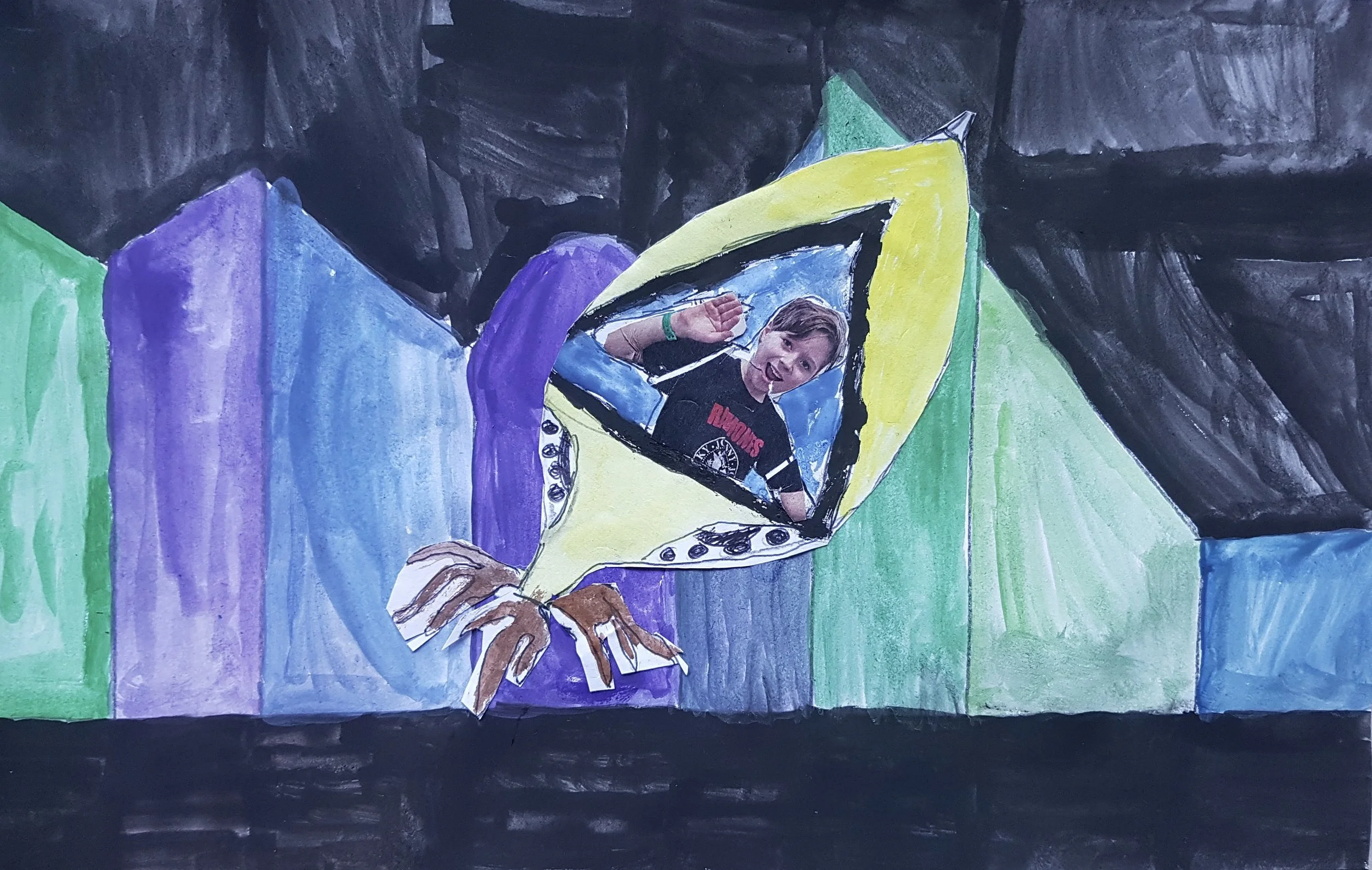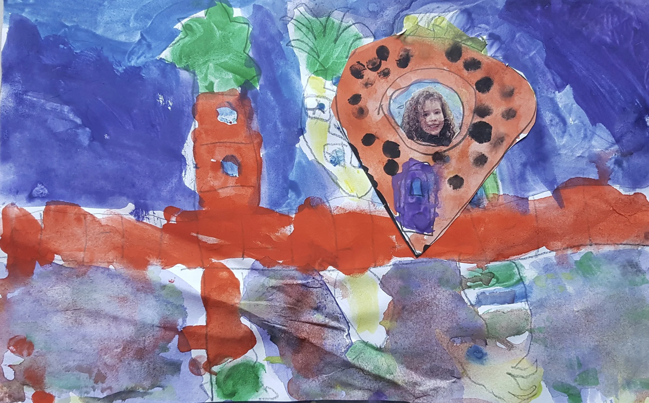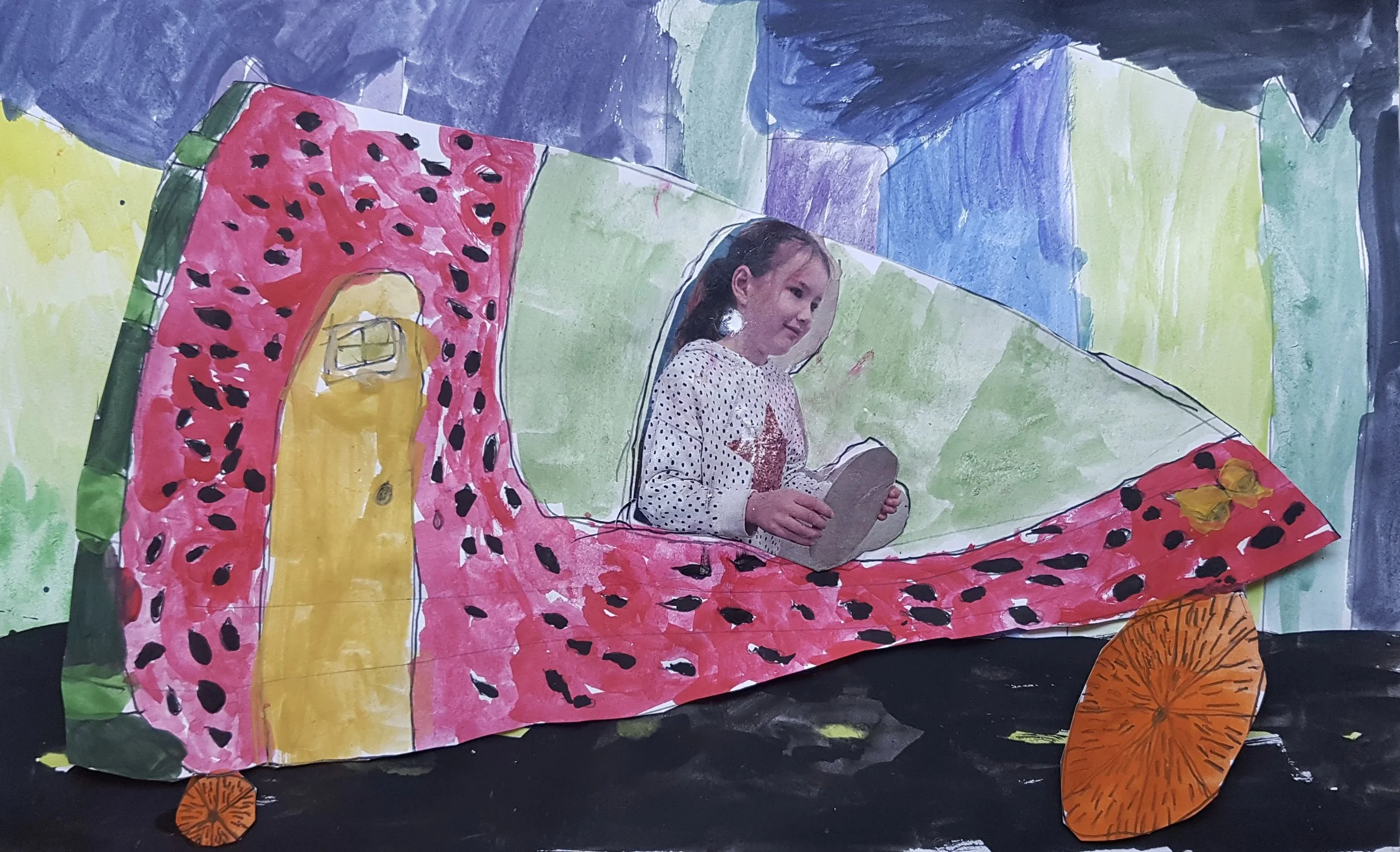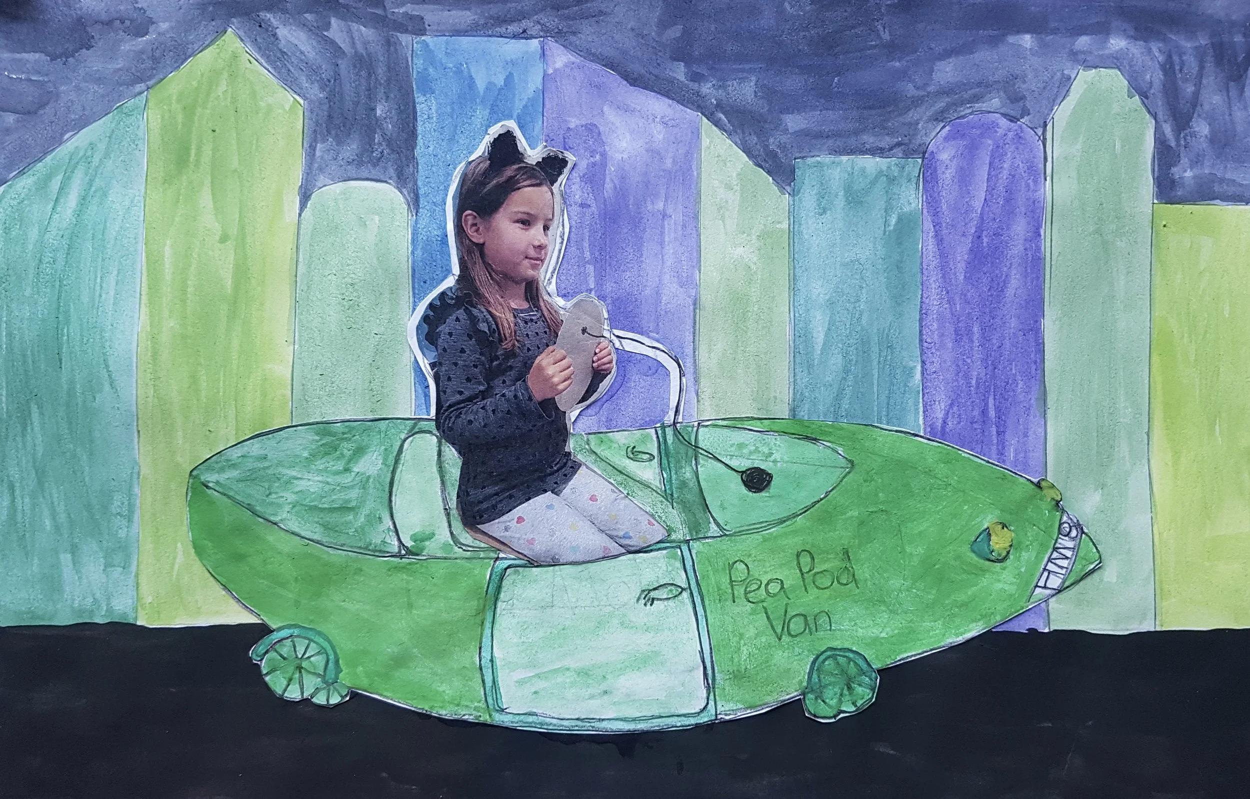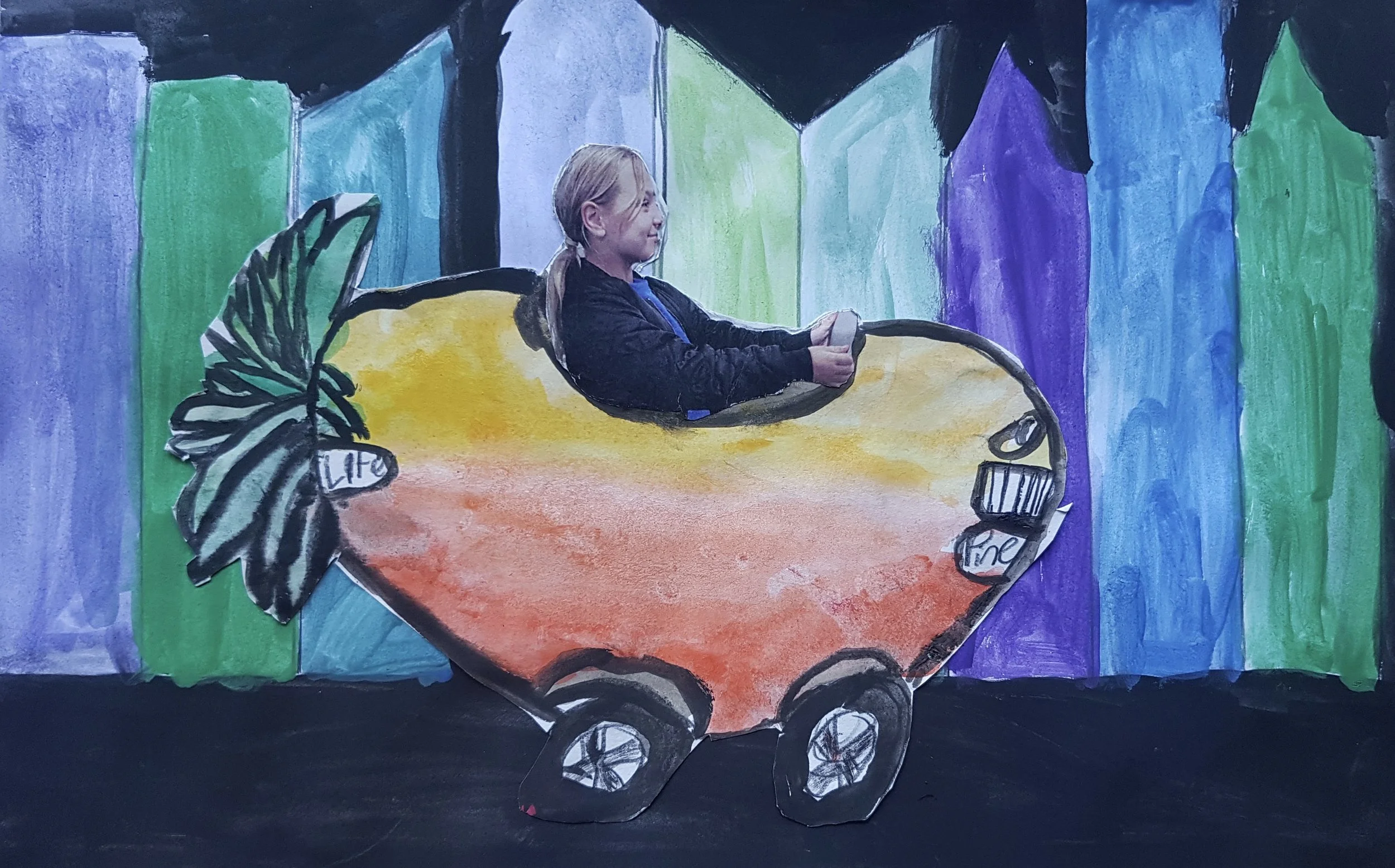 The students painted their veggie vehicles using watercolour paints, paying careful attention to blending their paints and creating intensity of colour. They used a limited colour palette of cool colours to paint the background cityscapes. The brightly coloured vehicles pop out in contrast against the cool coloured cityscape creating the illusion of foreground and background. I had a great final day of the term with Karli’s creative class and am really proud of their finished artworks.