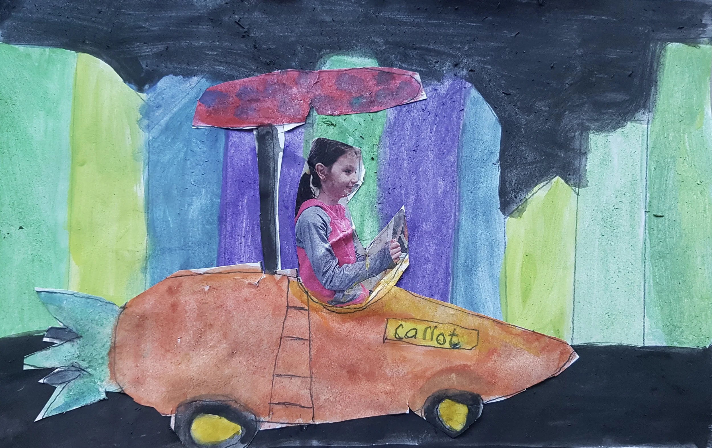 The class studied printed images of the vehicles in Busytown by Richard Scarry. They carefully sketched different representations of parts of vehicles, such as wheel arches, mirrors, hub caps, wheels, number plates, windows and windscreens. Using their study drawings the students created thumbnail sketches of possible vehicles, choosing their favourite one to recreate as a final drawing.